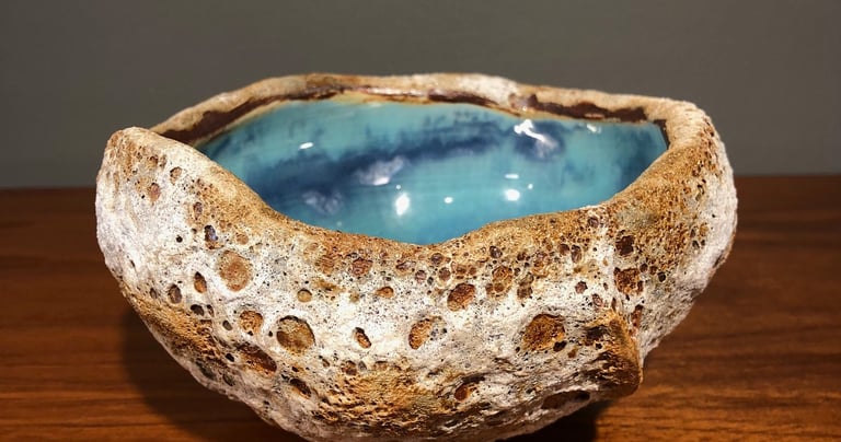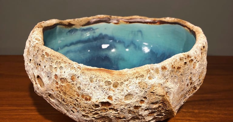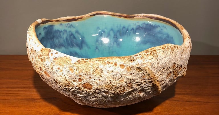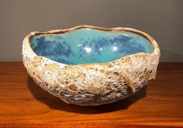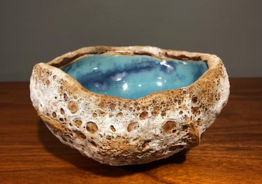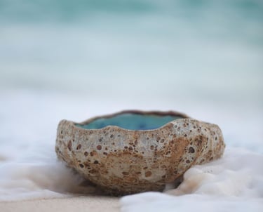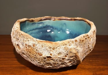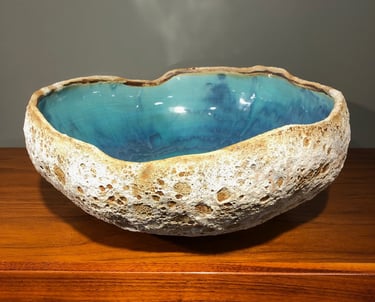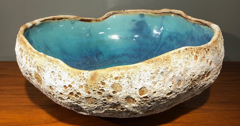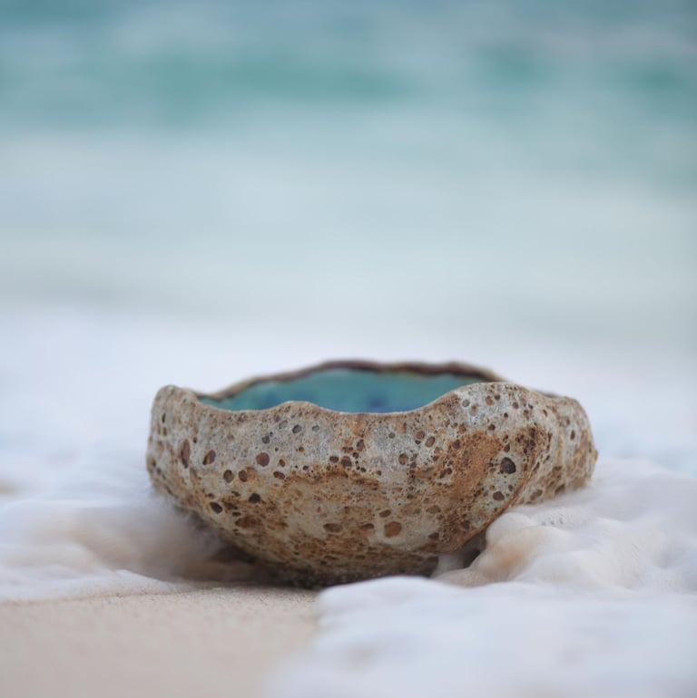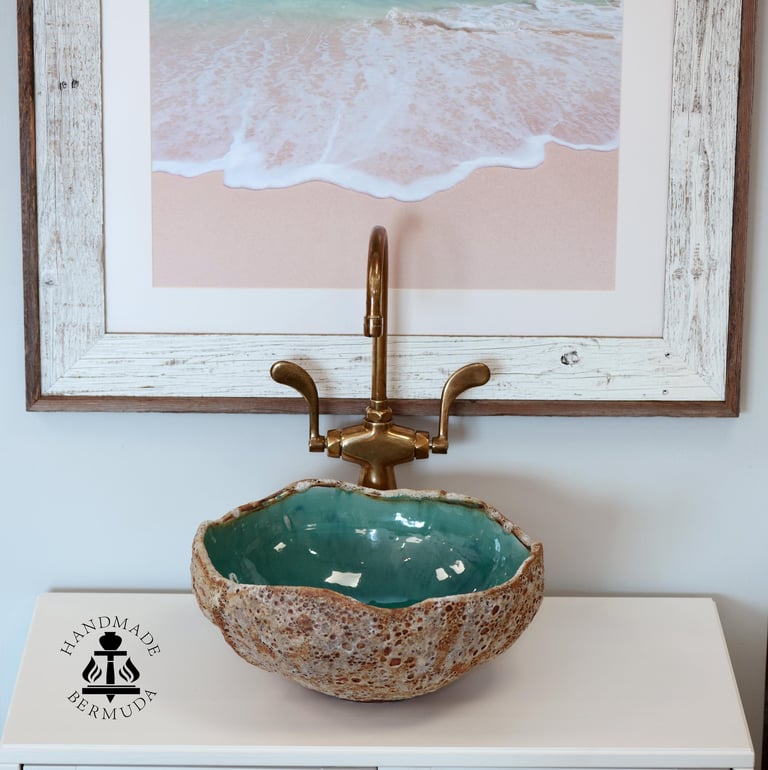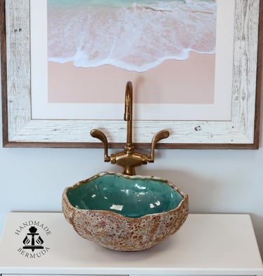 Bermuda Rockpools capture the beautiful turquoise and blue ocean on the interior and the harsh, rough limestone rock on the exterior. We use Porcelain and Stoneware clays with two slips and four different glazes to achieve this unique, remarkable likeness of ocean rockpools.